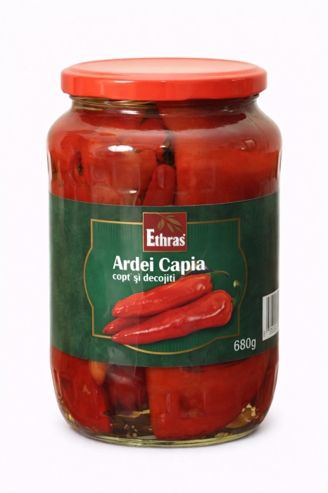 Ardei Capia Copti Ethras 680 g sunt ardei capia copti si decojiti, conservati in otet cu indulcitor, pentru un gust placut si echilibrat. Produs ideal pentru salate, garnituri sau preparate traditionale, gata de servire direct din borcan.