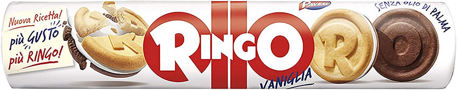 Pavesi - Biscuiti Ringo Vanilie - Biscuiti pentru Gustarea Ta sau Pauza de Studiu - 165 g. Mici si mari provocari pentru toti campionii care au nevoie de energie in fiecare zi pentru a face fata zilei, cu Ringo vei avea energia potrivita. Biscuiti gustoasi cu umplutura de vanilie. Produsele Pavesi sunt realizate cu toate ingredientele de calitate, oua proaspete din gaini de crescatorie in aer liber categoria A, cacao si ciocolata selectate dupa principiile de responsabilitate.