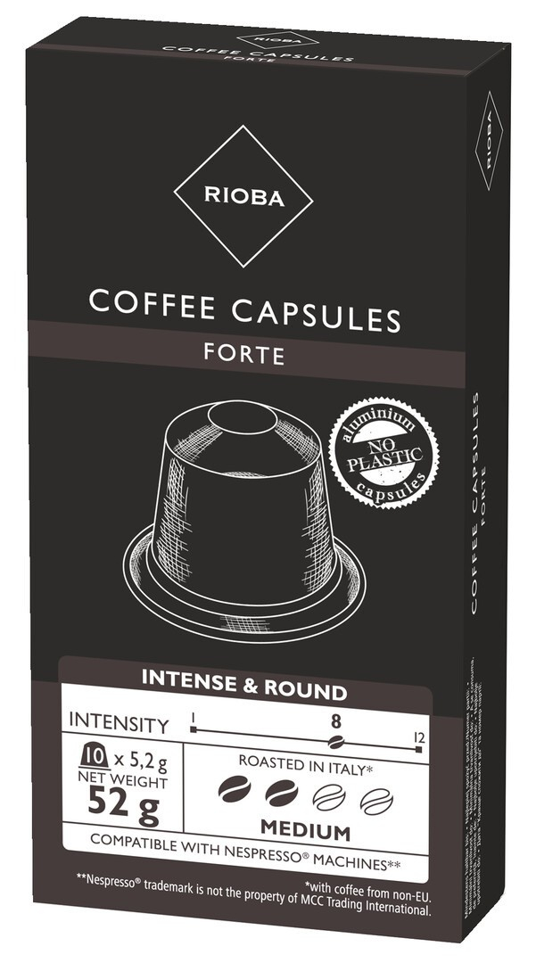 Capsule cafea Rioba Forte compatibile Nespresso, espresso intens cu aroma bogata si crema consistenta, 10 capsule.