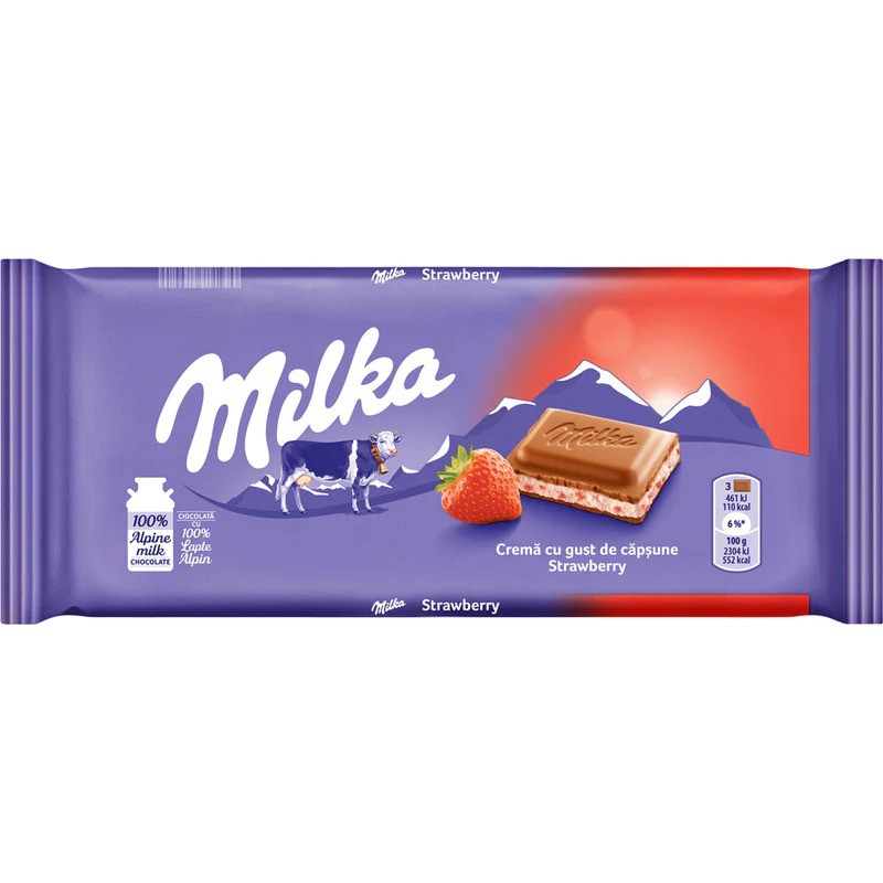 Ciocolata Milka Alpine cu Crema de Capsuni 100g este alegerea ideala pentru cei care iubesc combinatia dintre ciocolata fina si fructe proaspete – perfecta pentru o pauza dulce, un moment de relaxare sau un mic cadou plin de tandrete.
