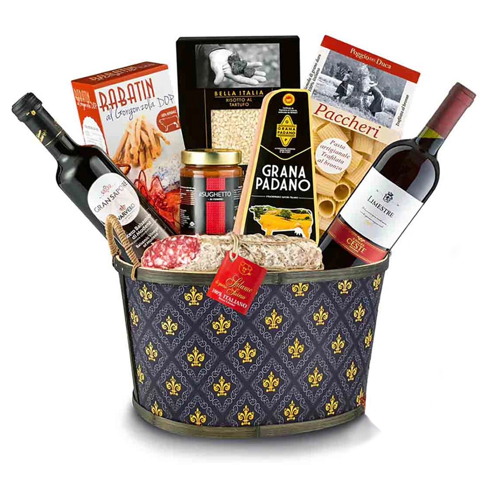 Acest cos de depozitare din lemn oval, decorat in negru, atrage atentia in acest pachet frumos. Cosul este alcatuit cu produse italiene autentice, precum o bucata de branza Grana Padano si un delicios vin rosu Cabernet.
