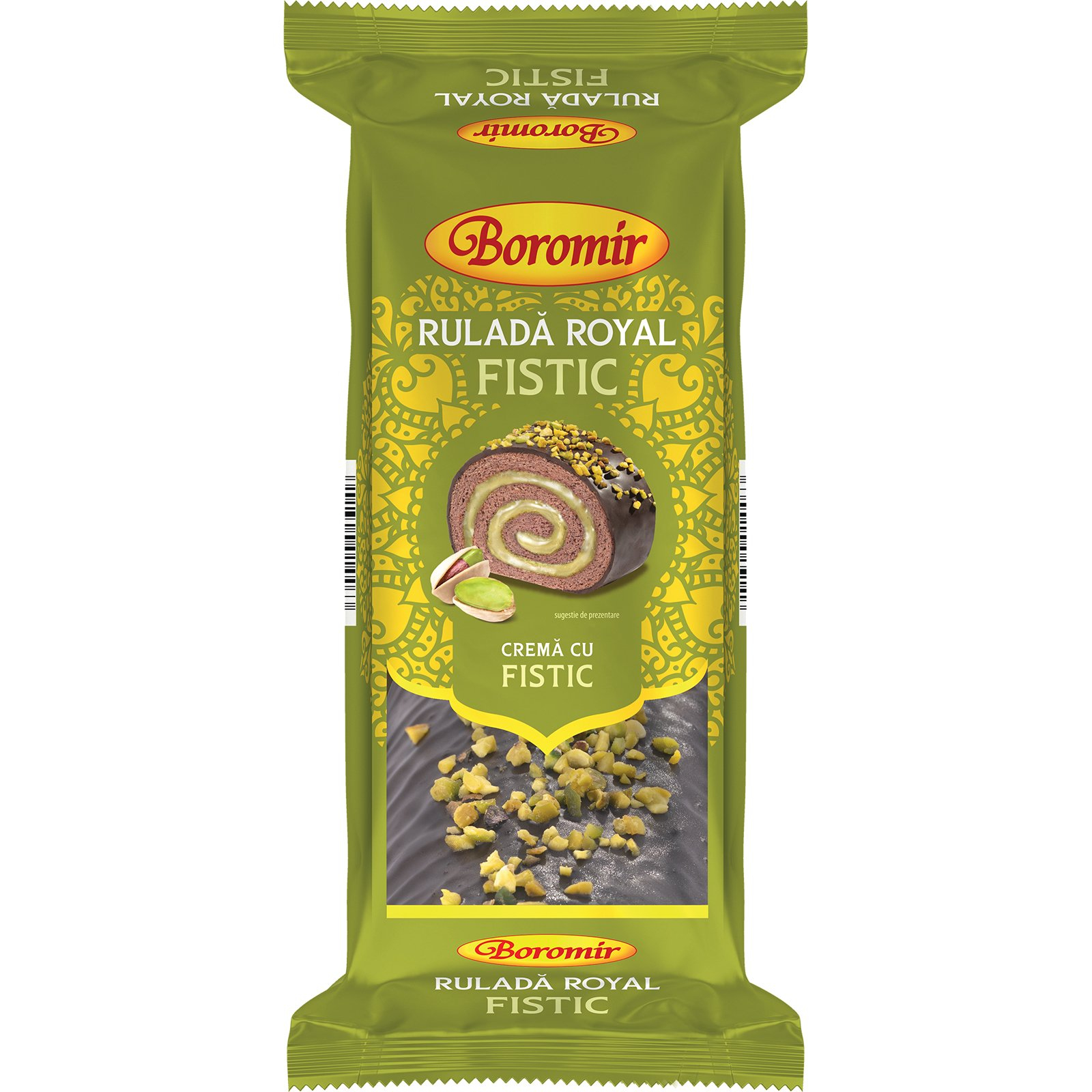 Rulada Royal cu crema de fistic Boromir 350 g este desertul rafinat care imbina blatul pufos cu crema fina de fistic, glazura delicioasa de ciocolata si toppingul crocant de fistic maruntit. Cu un gust intens si o textura catifelata, rulada Boromir este alegerea perfecta pentru un moment de rasfat sau pentru a impresiona invitatii la masa. Produs realizat din ingrediente atent selectionate, cu pasta naturala de fistic (2%) si fistic granulat (2.5%), glazura de ciocolata si blat pufos de pandispan.