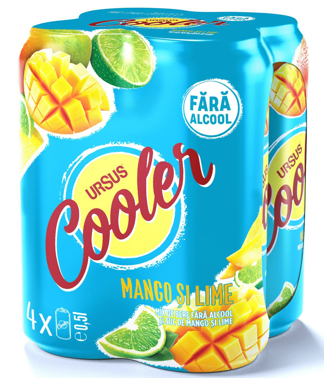 Bere blonda fara alcool cu aroma de mango si lime Ursus Cooler, 4x 0.5 l