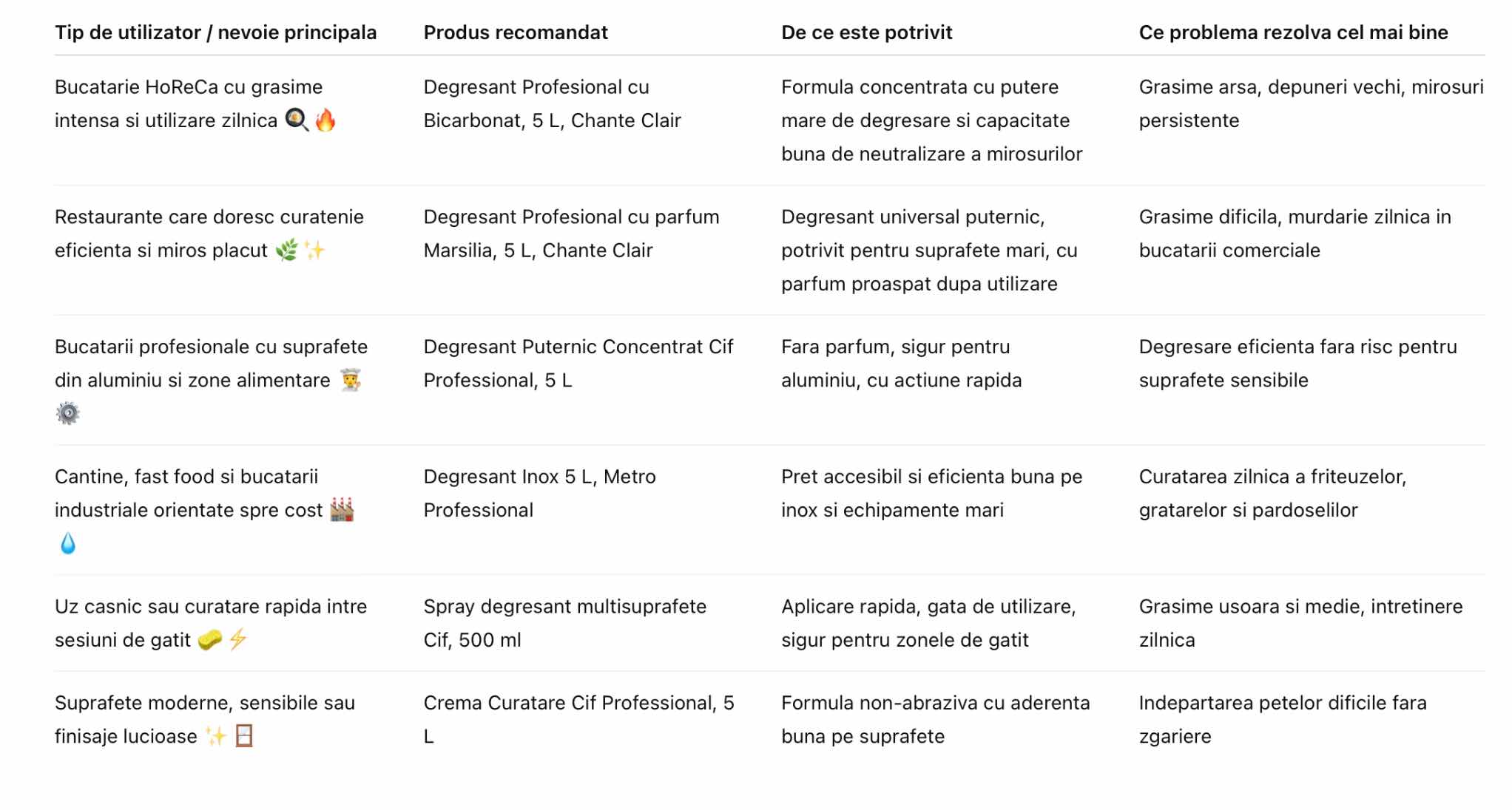 In bucatariile HoReCa, grasimea nu este ocazionala, ci constanta. De aceea, primul criteriu de selectie trebuie sa fie puterea reala de degresare. Pentru aragazuri, hote, gratare sau friteuse, sunt necesare formule concentrate, capabile sa dizolve grasimea arsa si depunerile vechi fara frecare excesiva. Produsele profesionale sunt gandite special pentru acest tip de murdarie intensiva si reduc semnificativ timpul de curatare.