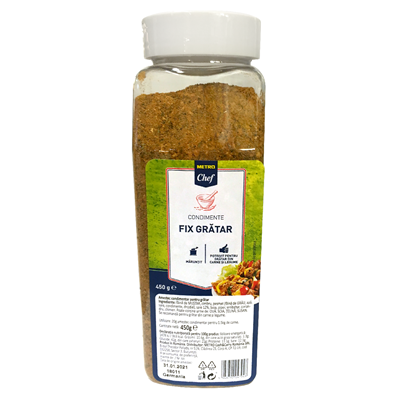 Mix Condimente pentru Gratar Metro Chef 450 g este un amestec profesional de condimente atent dozate, creat pentru a oferi preparatelor la gratar un gust intens, echilibrat și savuros. Formula combina ingrediente cheie precum sare, piper, paprika, usturoi, ceapa și ierburi aromatice pentru a accentua aroma carnii și legumelor la gratar, fara a acoperi gustul natural al ingredientelor.