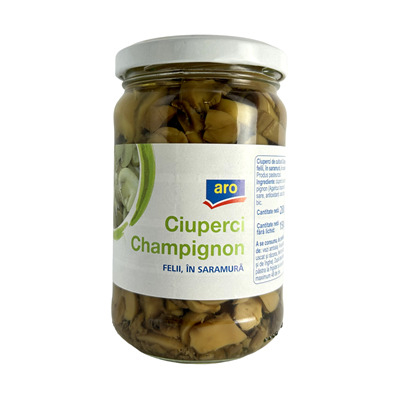Ciuperci Taiate Aro 280 g sunt ciuperci Champignon (Agaricus bisporus) conservate in saramura (apa cu sare 1.24%), ideale pentru preparate rapide si gustoase. Au textura flexibila, ferma si un gust usor sarat, cu aroma specifica placuta. Sunt gata taiate felii, ceea ce le face perfecte pentru pizza, paste, salate, omlete, supe sau tocanite.