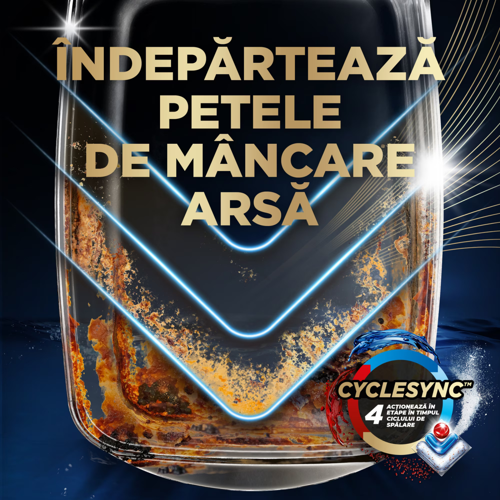Prima capsula Finish cu tehnologie Cyclesync elibereaza ingredientele in 4 etape diferite in timpul ciclului de spalare.