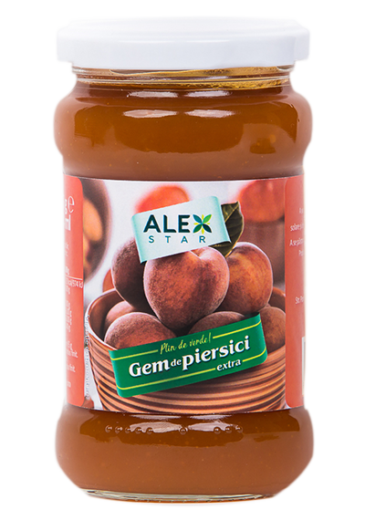 Gem de piersici Alex Star, cu gust dulce si aroma naturala, ideal pentru mic dejun, clatite si prajituri. Borcan de 375 g.