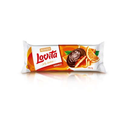 Biscuitii Lovita cu jeleu de portocale de la Roshen sunt alegerea perfecta pentru cei care prefera deserturile cu note fresh si aromate. Biscuitii foarte moi sunt inveliti intr-o glazura fina de ciocolata (15%) si contin un jeleu delicat de portocale, imbogatit cu suc concentrat si ulei natural de portocale.