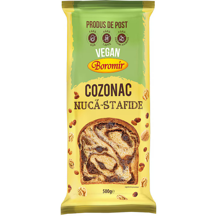 Descopera un cozonac vegan pufos, umplut cu o crema de nuca fina si stafide dulci, perfect pentru cei care doresc un desert sanatos, fara ingrediente de origine animala. Fara oua si lapte, acest cozonac de 500 g Boromir pastreaza traditia gustului autentic, fiind ideal pentru perioada de post sau pentru un desert vegan gustos si nutritiv. 🌱✨