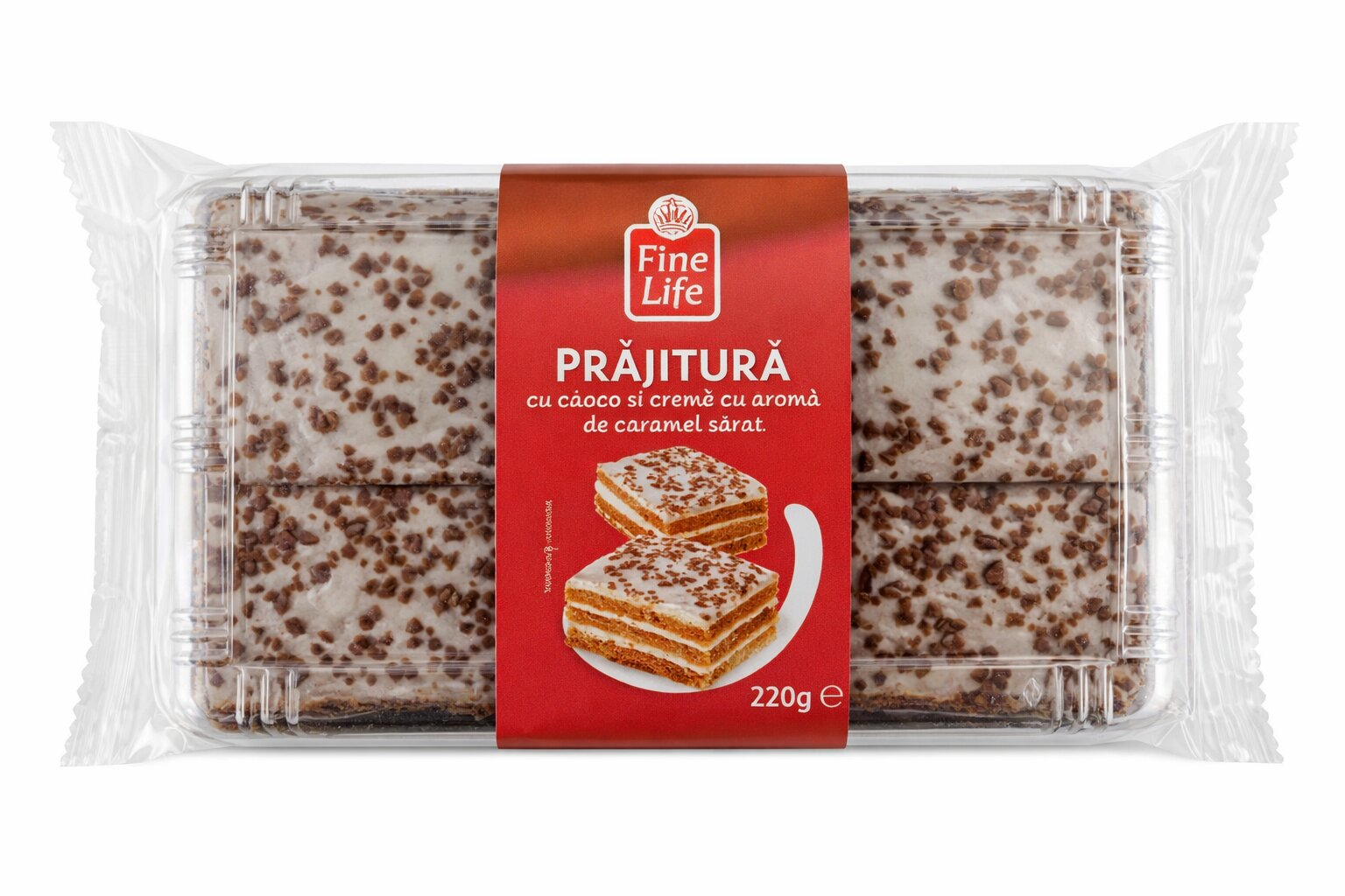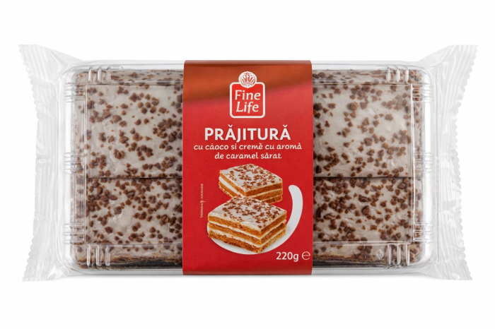 Prajitura cu Cacao si Crema de Caramel Sarat, Fine Life, 220 g este un desert delicios, cu un echilibru perfect intre gustul intens de cacao si notele fine de caramel sarat. Cele trei straturi de pandispan de cacao, pufoase si bine insiropate, ofera o textura placuta si un gust bogat, completate de o crema fina, aerata si aromata.