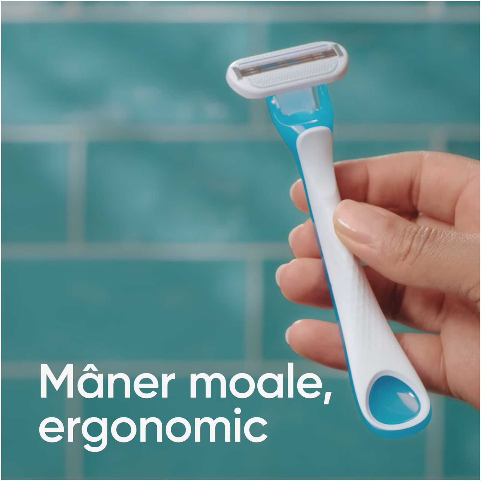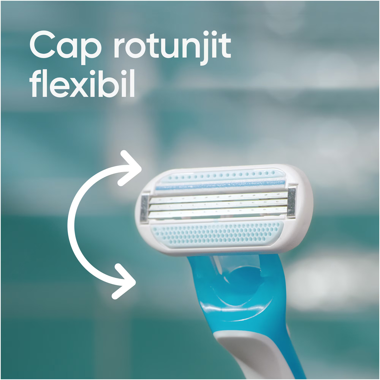 Cu aparatele de ras de unica folosinta Gillette Venus3, te bucuri de o piele fina, cu mai putine iritatii. Aparatele de ras de unica folosinta pentru femei Gillette Venus 3 asigura un epilat precis. Aparatele de ras care pivoteaza au 3 lame si o banda hidratanta pentru alunecare, precum si micro-nervuri protectoare, care ajuta la reducerea zgarieturilor si taieturilor.