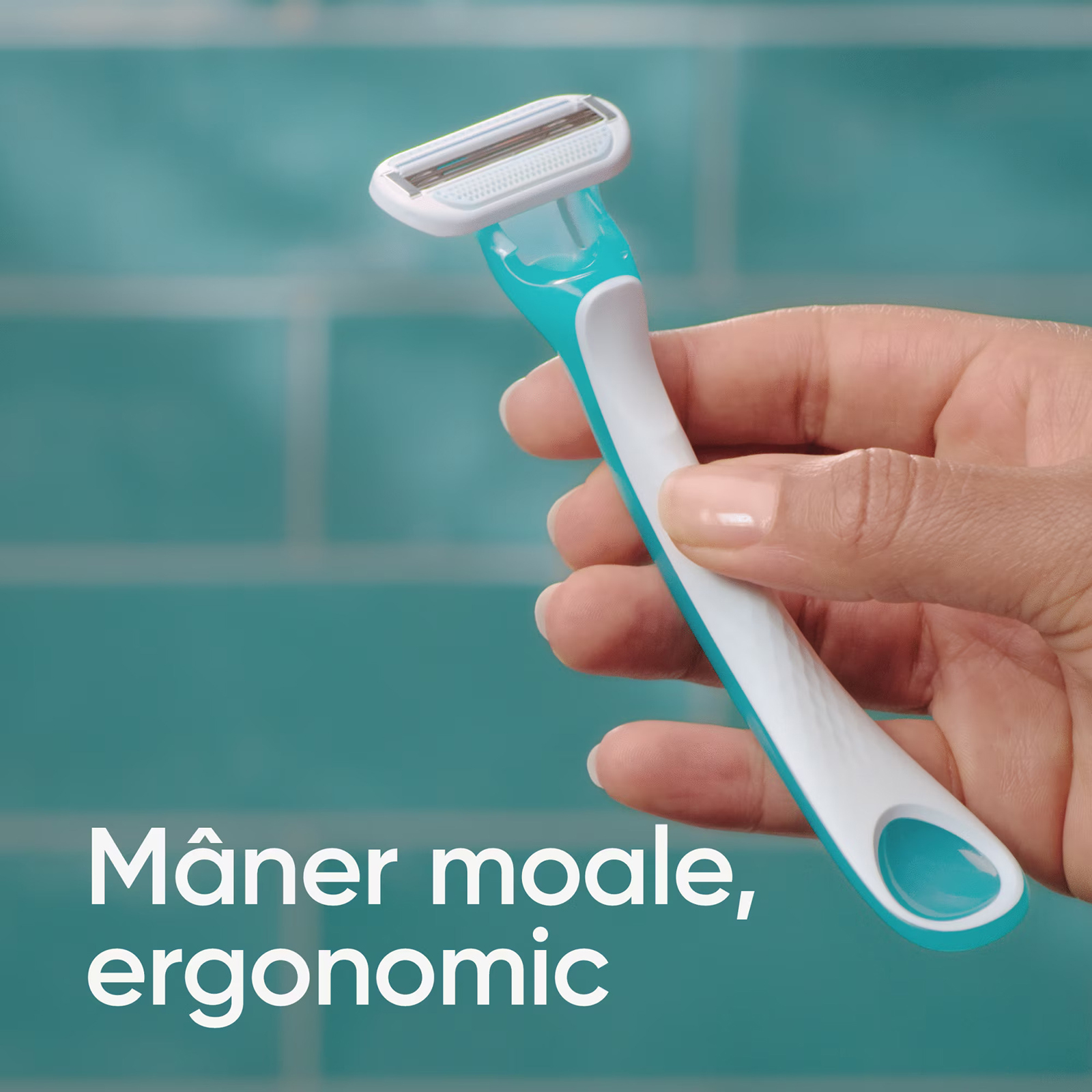 Aparatele de ras Venus pentru femei sunt concepute pornind de la imaginea corpului feminin. Aparatele de ras pentru femei Venus Tropical ofera un ras delicat, aproape de piele, realizat cu usurinta. Aceste aparate de ras de unica folosinta pentru femei au 3 lame ce urmaresc formele corpului si includ un cap pivotant care raspunde la modificarile subtile ale contururilor corpului. Cu un maner parfumat pentru a conferi barbieritului un parfum tropical proaspat.