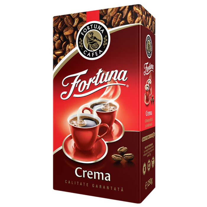 Ambalajul de 250 g pastreaza prospetimea si aroma cafelei pentru o perioada indelungata, fiind practic pentru consumul zilnic. Fortuna Crema este o cafea apreciata pentru constanta gustului si calitatea sa, potrivita atat pentru acasa, cat si pentru birou.