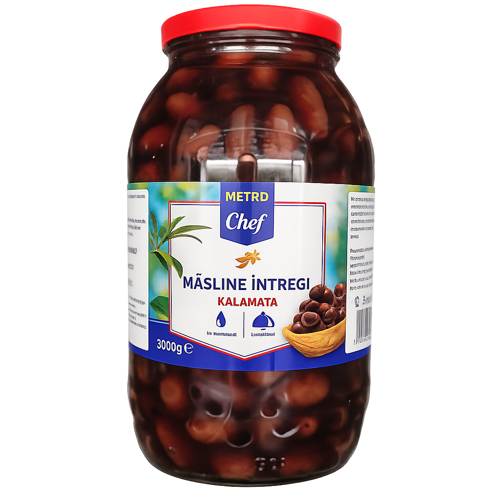 Masline Kalamata Metro Chef, calibru 181-200, ambalate la 2 kg, ideale pentru bucatarii profesionale sau consumatori care apreciaza gustul autentic mediteranean. Maslinele sunt intregi, cu samburi, atent selectionate, avand o textura ferma si o aroma intensa, specifica soiului Kalamata. Sunt potrivite pentru gustari, platouri cu mezeluri si branzeturi, salate sau preparate din bucataria mediteraneana.