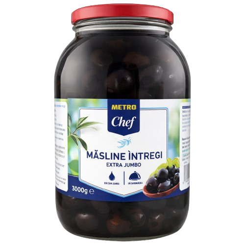 Masline Negre Extra Jumbo Metro Chef, calibru 161-180, ambalate la 1.8 kg, sunt masline intregi, de dimensiune mare, conservate in saramura si gata de consum. Datorita calibrului Extra Jumbo, aceste masline se remarca prin aspectul atractiv si textura carnoasa, fiind ideale pentru platouri aperitiv, gustari sau preparate inspirate din bucataria mediteraneana.