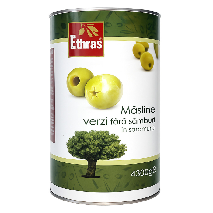 Masline Verzi fara Samburi Ethras, ambalate in saramura in cutie metalica de 2 kg, sunt ideale pentru consum ca atare sau ca ingredient in salate, pizza, aperitive si preparate mediteraneene. Au gust echilibrat, textura ferma si sunt atent selectionate din culturi din Egipt, oferind calitate constanta pentru uz casnic sau horeca.