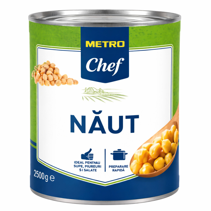 Nautul Metro Chef 2.5 kg este un produs sterilizat, ideal pentru utilizare profesionala in bucatarii HoReCa, dar si pentru uz casnic. Boabele de naut sunt intregi, uniforme si nu excesiv de ferme, ceea ce le face usor de prelucrat in diverse retete. Produsul este gata fiert, nu necesita preparare indelungata si poate fi folosit imediat dupa deschidere.