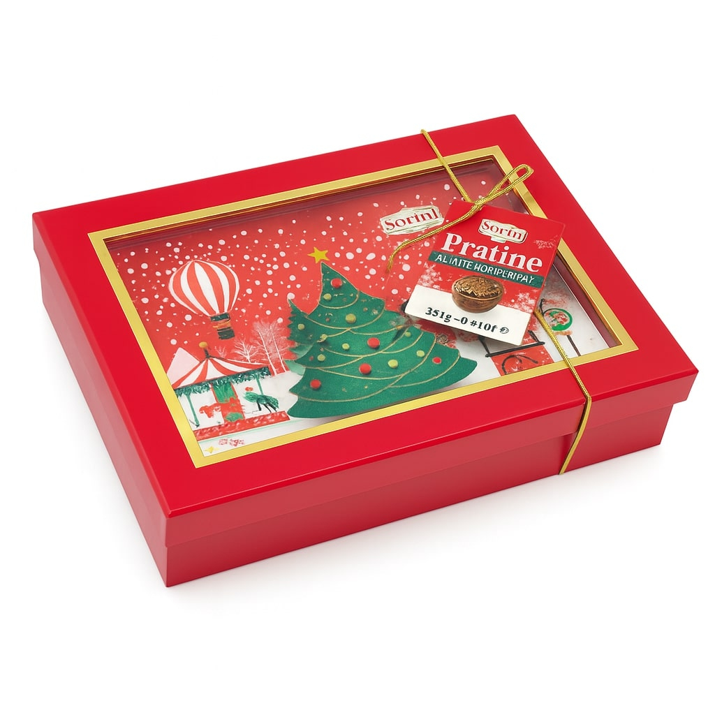 Pralinele Sorini in Cutie de Craciun 3D 250 g sunt un cadou delicios si festiv, prezentat intr-o cutie in relief cu decoratiuni de sarbatori si design cu fulgi de zapada. Ambalajul tridimensional transforma acest produs intr-un ornament deosebit, perfect pentru a fi oferit celor dragi sau pentru a completa atmosfera de Craciun.